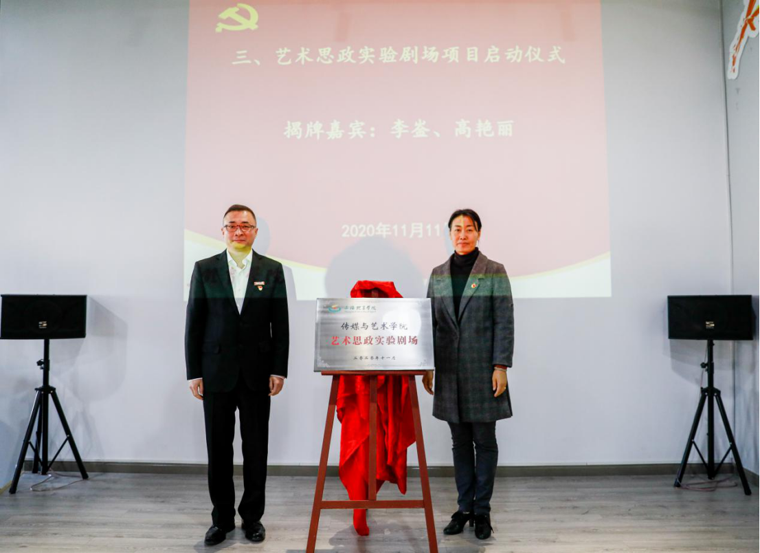 在主题党日活动最后,李崟、高艳丽共同为传媒与艺术学院“艺术思政实验剧场”项目揭牌,这将是传艺学院打造课程思政的新尝试,以专业为媒、以思政为魂,高举红色旗帜,唱响红色旋律。