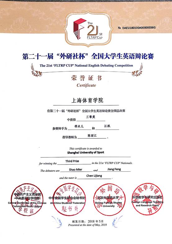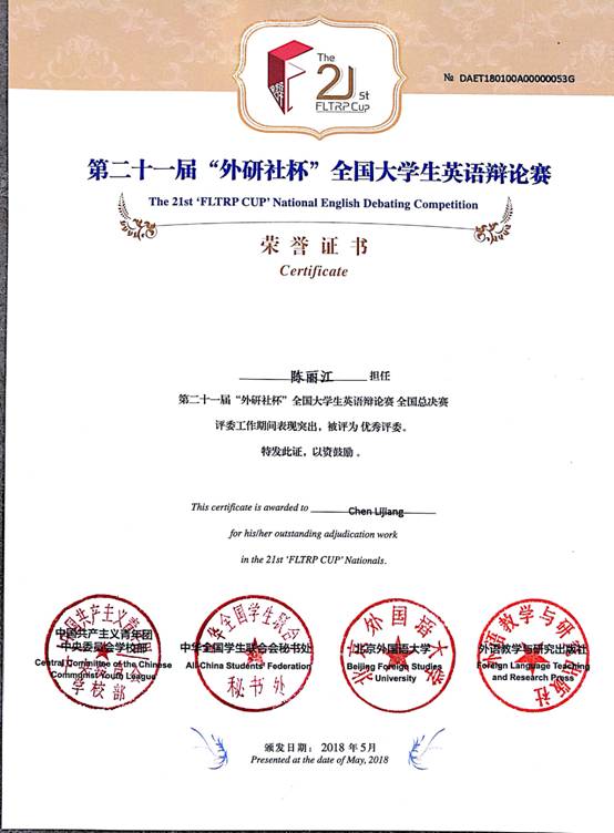 5月22日,由共青团中央学校部、全国学联秘书处和北京外国语大学联合主办,外语教学与研究出版社和北京外国语大学团委承办的第二十一届“外研社杯”全国大学生英语辩论赛全国总决赛在北京外国语大学落下帷幕,我校新外学院学生邵米儿和江枫同学获全国三等奖,指导教师陈丽江获指导奖和优秀评委。
