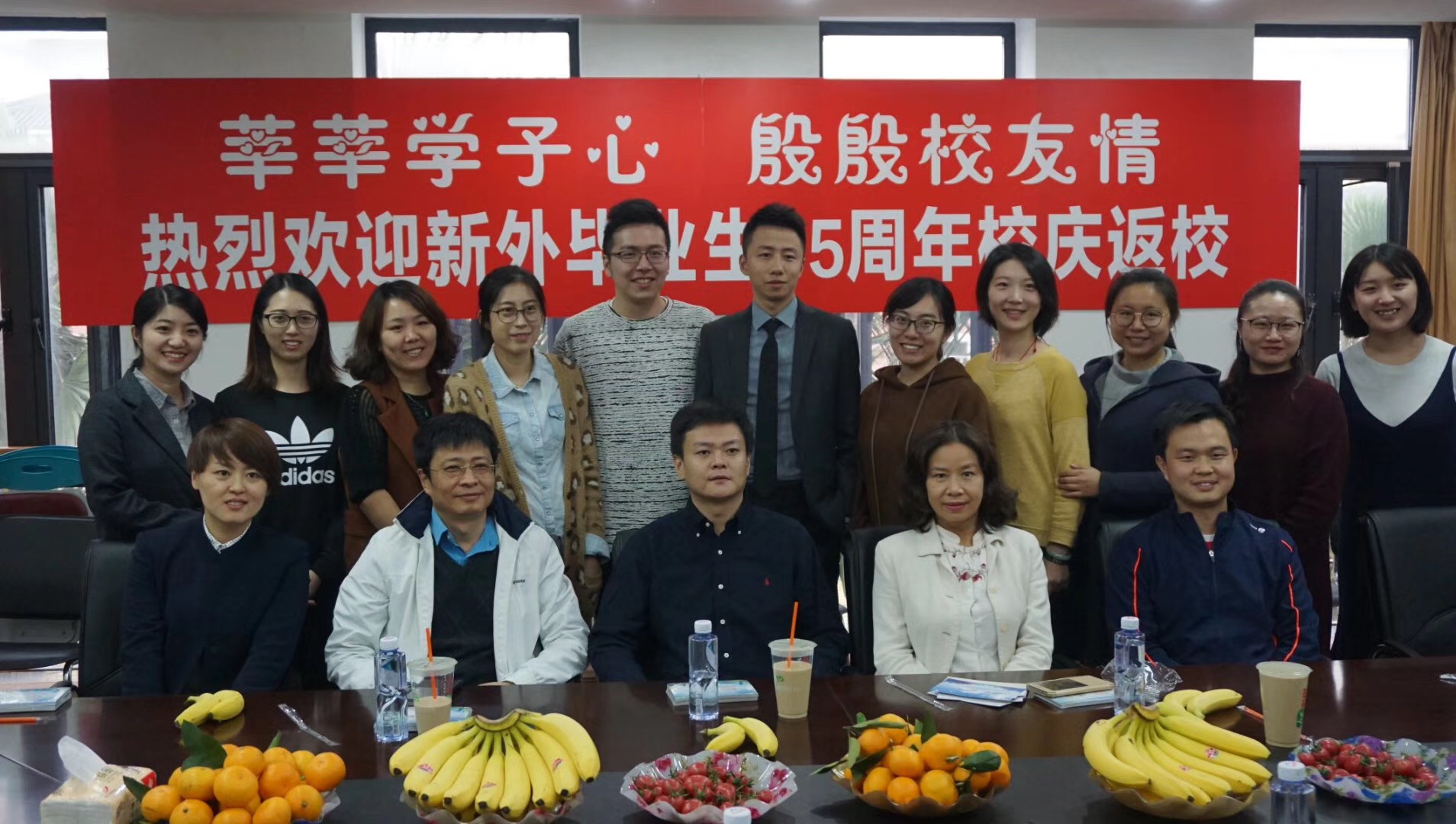 新外学院总支书记张盛、院长杜友君、副院长陈丽江与校友们座谈,他们祝愿校庆“回家”的特殊校友们在上体的各自岗位上共建共享学校发展,做好个人职业生涯规划,在一所追求卓越的大学成就一流的业绩,谋划幸福人生。