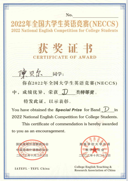 大学英语课程教学重视过程性评价,把过程性评价与终结性评价相结合,加强学习过程监测、评估与反馈,以培养自主学习能力为先,以加强语言应用实践能力为重,以提升可持续发展能力为本,强调在大学英语教学中对学生价值观念的引导,突出跨文化能力的培养。近年来,团队指导我校学生在国家级、省部级赛事中获得了多项优异成绩。如,2022年全国大学生英语竞赛中,我校学子陈贝尔、黄雨莎在上海市决赛中分别荣获特等奖、一等奖的历史最好佳绩,陈贝尔同学将代表上海市参加今年的全国总决赛。
