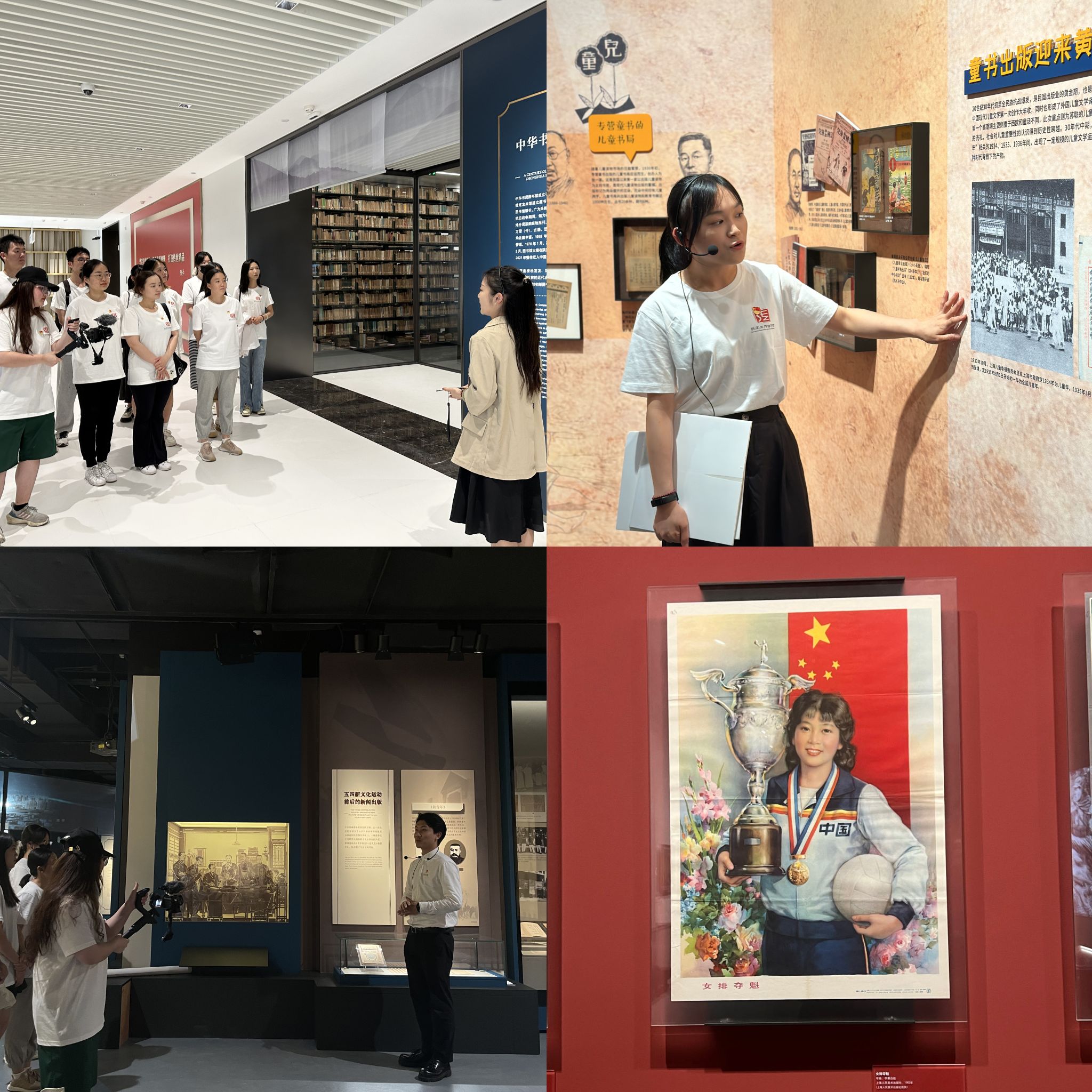 三楼儿童馆,同学们发现了一张熟悉的景观图片——绿瓦大楼。1933年10月,上海儿童幸福委员会的活动仪式正在绿瓦大楼前举行。本科生党员张安琪在这里向大家展示了1937年日军轰炸上海后绿瓦大楼被炸得残垣断壁以及日军在绿瓦前耀武扬威的图片,前后对比震撼人心。今日繁华如斯,岂能忘却历史。张安琪在讲解最后希望大家在每一次看到绿瓦大楼时都能够想起抗战的艰苦岁月,发愤图强,为中华民族伟大复兴做出属于自己的贡献。在四楼艺术设计馆,学院党委副书记、副院长张瑞青在宣传招贴“女排夺冠”前,用中国体育故事中对中国式现代化进行了具象的解读。和西方女权运动持续百年始终收效甚微相比,中国共产党领导下的妇女解放运动可谓是人类可歌可泣的人类史诗。反映中国妇女地位的高光标志,就是写入了中国共产党人的精神谱系的女排精神:“祖国至上、团结协作、顽强拼搏、永不言败”。