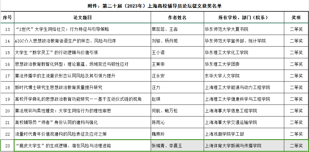 在近日举行的第二十届(2023年)上海高校辅导员论坛征文活动中,我院学工队伍积极组织参赛,以赛促学、以赛促建,切实提高我院辅导员队伍的理论水平和业务能力。其中,张瑞青、李晨玉撰写的论文《“脆皮大学生”的生成逻辑、潜在风险与治理进路》喜获二等奖,创下我院学生工作队伍最好成绩。