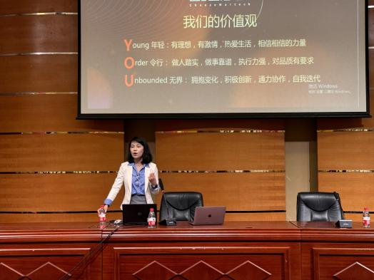 接着,李丹女士通过分享自己的职场经历向同学阐述,广告是一个永远年轻的行业,快速迭代,因为任何品牌或者产品都拥有被看见的需求。在这里,她能用视觉讲故事,以创意共情,保持好奇心去“较真”,找到时刻青春的感觉。