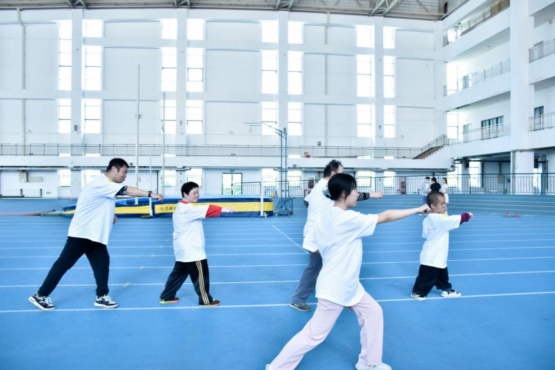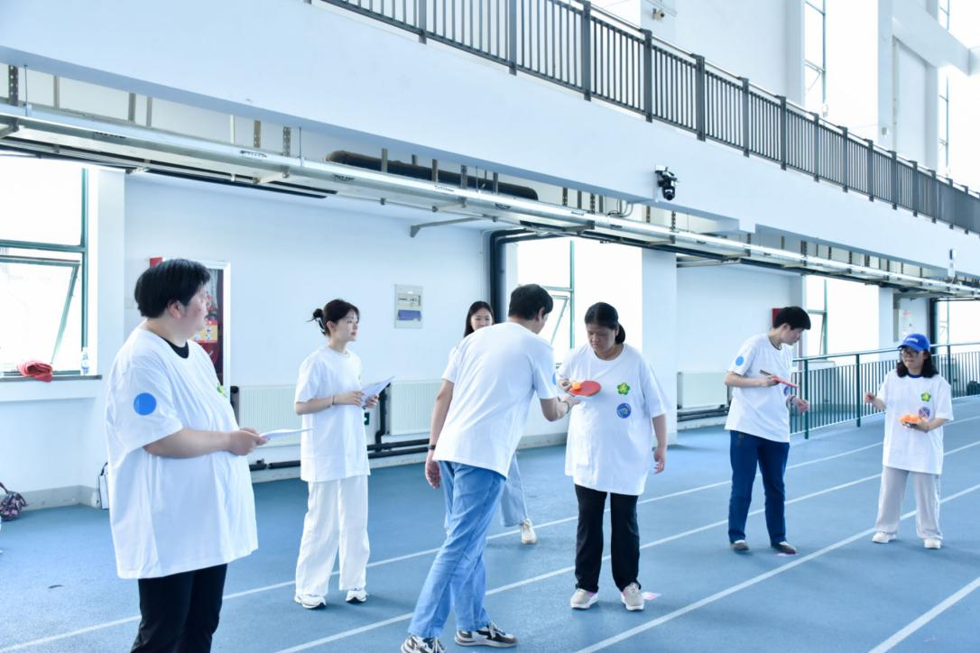 在进行充分的热身活动后,新传学子和社区残疾人朋友们分成4组,开始完成各个趣味项目的体验打卡。本次趣味运动会共设置了四个趣味项目,有考验平衡力的“国乒荣耀”,感受武术魅力的“一代宗师”,检验默契程度的“心有灵犀”,以及技巧和团队配合并重的“飞盘嘉年华”。这四项趣味活动,不仅考验运动能力,还重视团队成员间的配合,让残疾人朋友们感受到运动的乐趣和成功的喜悦。