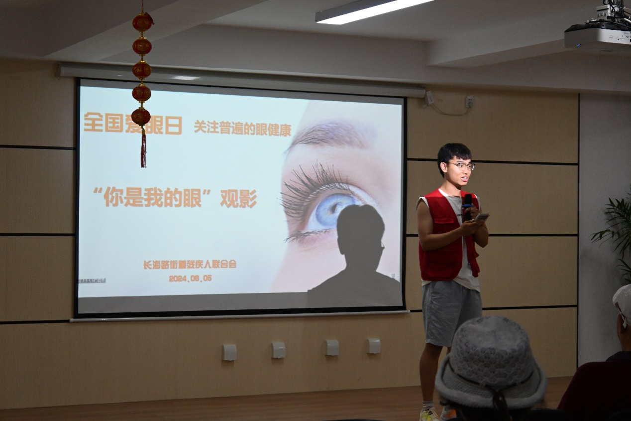 6月5日,在全国爱眼日前夕,tyc7111cc太阳成集团“你是我的眼”无障碍电影志愿服务团队的志愿者们前往长海路街道社区文化分中心阳光家园,为视力障碍的朋友们带来无障碍观影专场活动。
