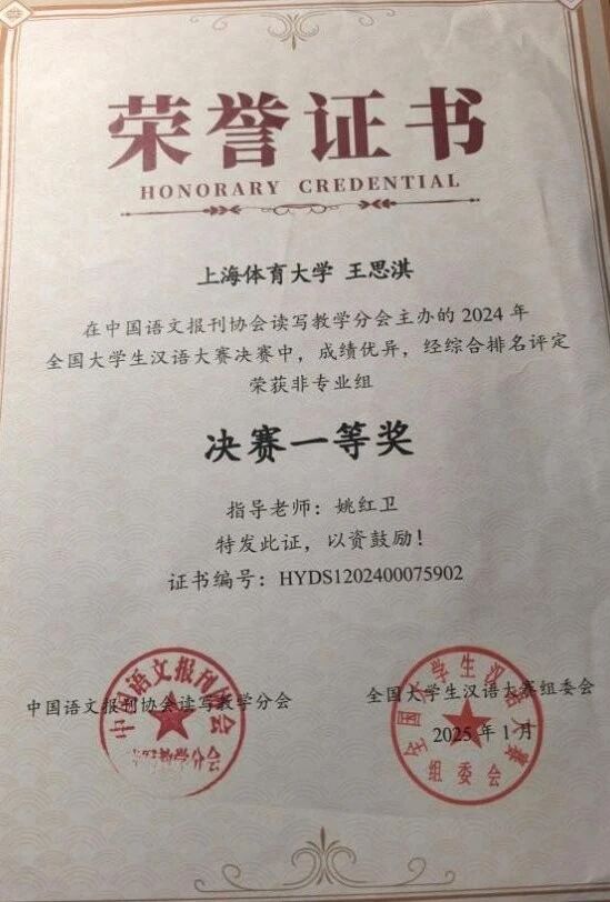 获奖者王思淇:非常荣幸在2024年全国大学生汉语大赛决赛中获得非专业组决赛一等奖的成绩。我很喜欢学习汉语文化,也向往能够学习更多文化知识。作为一名汉语基础课的学生,我曾对这门看似简单却博大精深的语言充满敬畏之心。感谢姚红卫老师的指导,老师耐心细致的讲解、生动有趣的课堂,让我从拼音的韵律到汉字的构造逐渐找到学习的节奏与信心,收获满满。在以后的日子里我会不急不躁继续学习,争取下次取得更好的成绩。