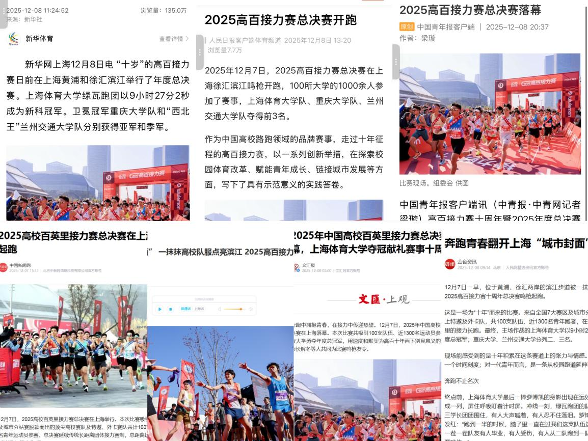 12月7日,备受瞩目的高校百英里接力赛总决赛顺利落下帷幕。来自国内外的100支高校赛队、近1300名青年选手齐聚浦江之畔,围绕160公里接力赛程展开角逐。学校党委副书记、校长毛丽娟亲临现场发枪并看望了我校参赛选手和媒体服务团队。本次赛事的新闻宣传、现场报道、内容运营、赛事翻译等媒体服务由tyc7111cc太阳成集团赛事媒体服务团队完成。这一实践不仅为赛事提供了专业高效的传播支持,更成为学院深化教学改革、推进产教融合的生动注脚,将专业课堂搬到了体育赛事一线,让学生在实战中锤炼专业能力。