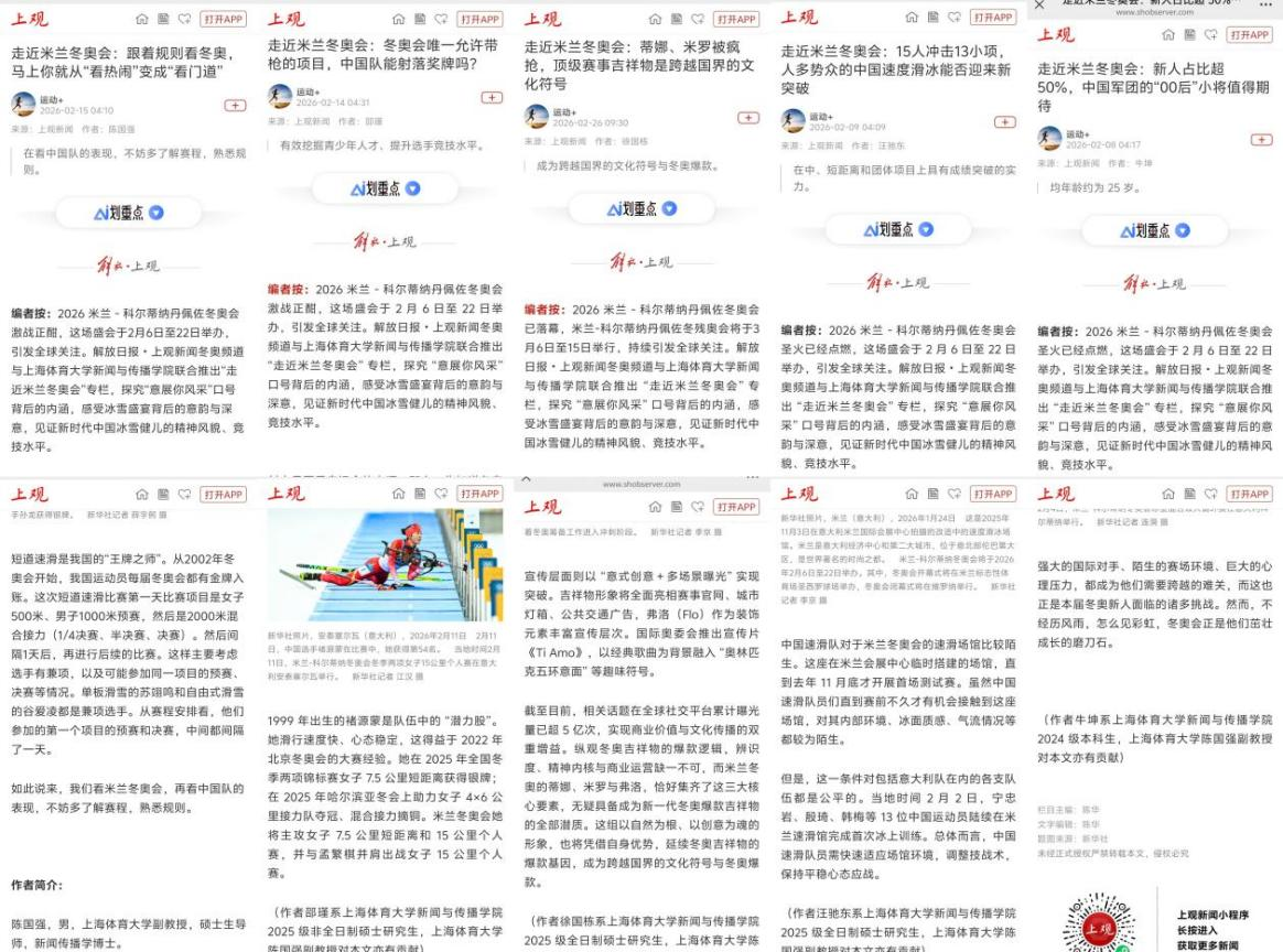 与此同时,学院与解放日报·上观新闻深度合作,联合推出“走近米兰冬奥会”专栏,学院13名师生组成主力撰稿团队,围绕冰雪项目解读、运动员观察、赛事前瞻、竞技分析等主题持续产出高质量原创内容。学生在教师指导下完成选题策划、深度撰稿、编辑打磨,多篇稿件在上观新闻冬奥频道正式刊发,将专业理论转化为主流媒体的优质内容生产力,实现了“课堂教学+主流媒体+国际赛事”的高度融合。