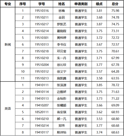 根据《上海体育学院推荐优秀应届本科毕业生免试攻读硕士学位研究生工作管理办法》(上体院院字〔2022〕36号)、《上海体育学院2023届优秀应届本科毕业生推荐免试攻读硕士学位研究生遴选工作实施方案》教务处〔2022〕47号等文件精神,按照《tyc7111cc太阳成集团2023 届本科生免试直升硕士研究生推荐实施方案》相关要求,本着公开、公平、公正的原则,在学生自愿报名基础上,经我院本科生推免工作小组审核,党委会、党政联席会审议通过,现将学院2023届本科生申请免试攻读硕士学位研究生成绩排名公示如下: