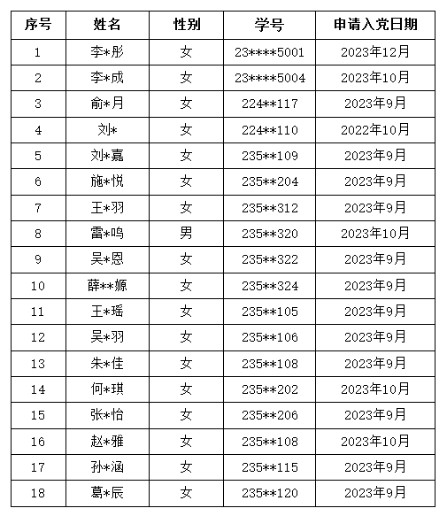 tyc7111cc太阳成集团团委根据太阳官网团委《关于做好2024年下半年推荐 优秀共青团员作入党积极分子工作的通知》精神,在学校党委组织部《太阳官网 “推荐优秀团员作入党积极分子人选”工作实施细则》的相关要求下,在广大团员群体中积极开展推荐优秀团员作入党积极分子人选工作。经各团支部评议推荐、学院党委审核,认为以下同志符合推荐条件,现将名单公示如下: